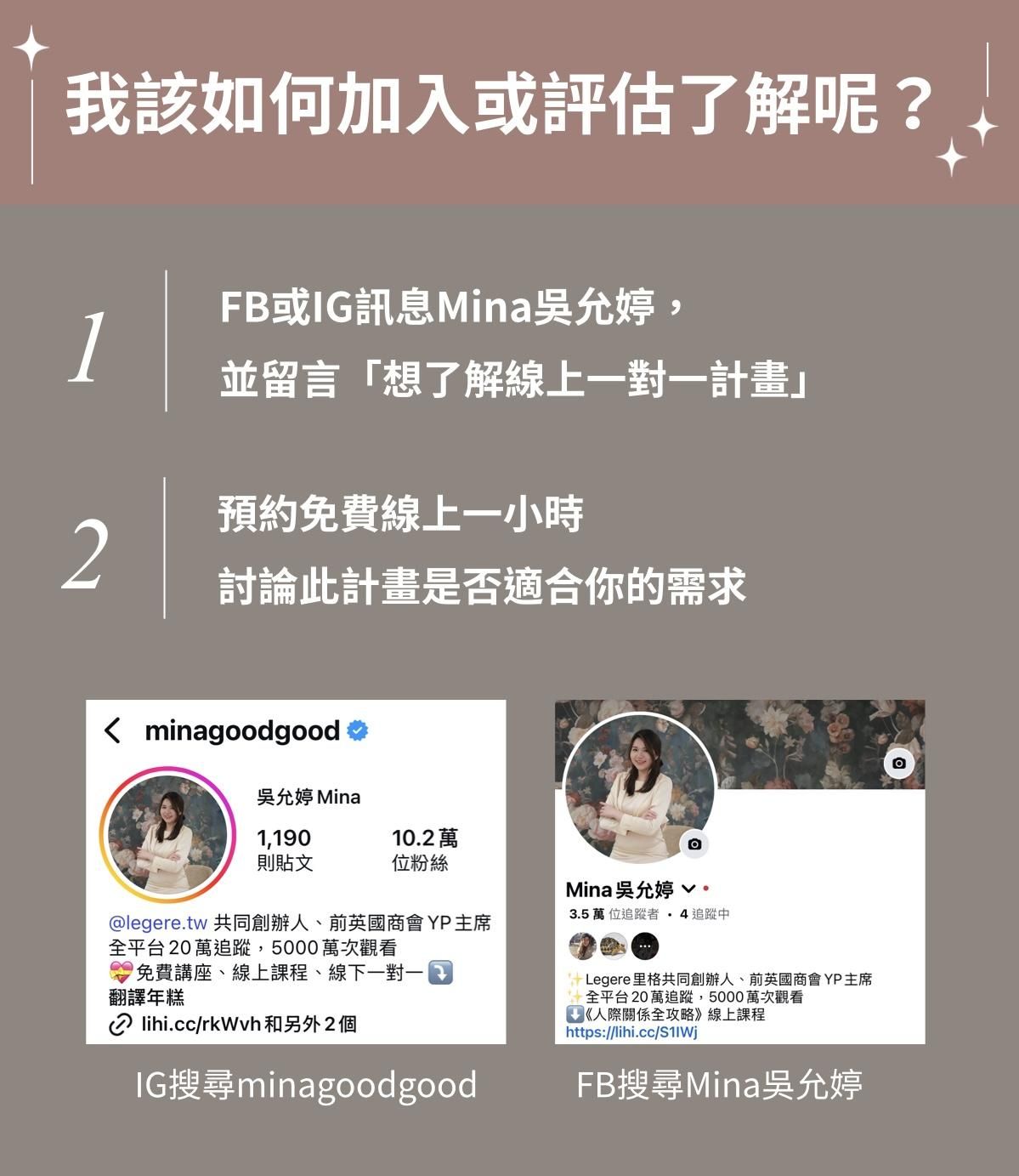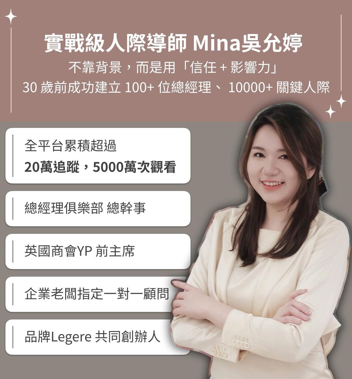 Mina擁有逾十年與上百位企業高階總經理的深度交流經驗,累積超過一萬條關鍵人際連結。